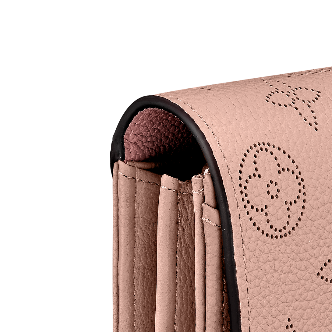 The sophisticated Iris wallet is crafted from Mahina leather, an exceptionally supple calfskin with delicate Monogram-pattern perforations. Its feminine, rounded flap opens to reveal two roomy compartments, a zipped pocket for coins and numerous card slots. This wallet is notable for refined details, such as its engraved, siLthtVer-tone press-stud.